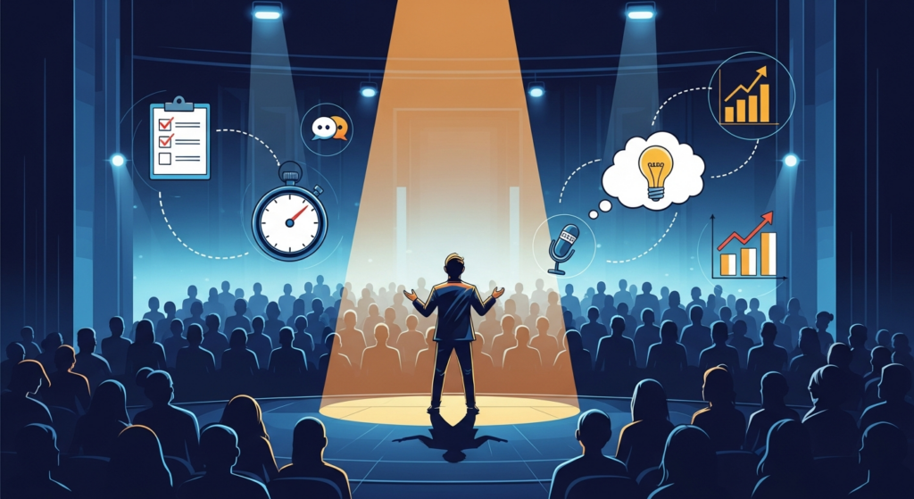 - 聴衆の前提知識レベルを推定する:自分の話す内容が「簡単すぎないか」「難しすぎないか」を事前に調整し、質問攻めや無反応を防ぐ。