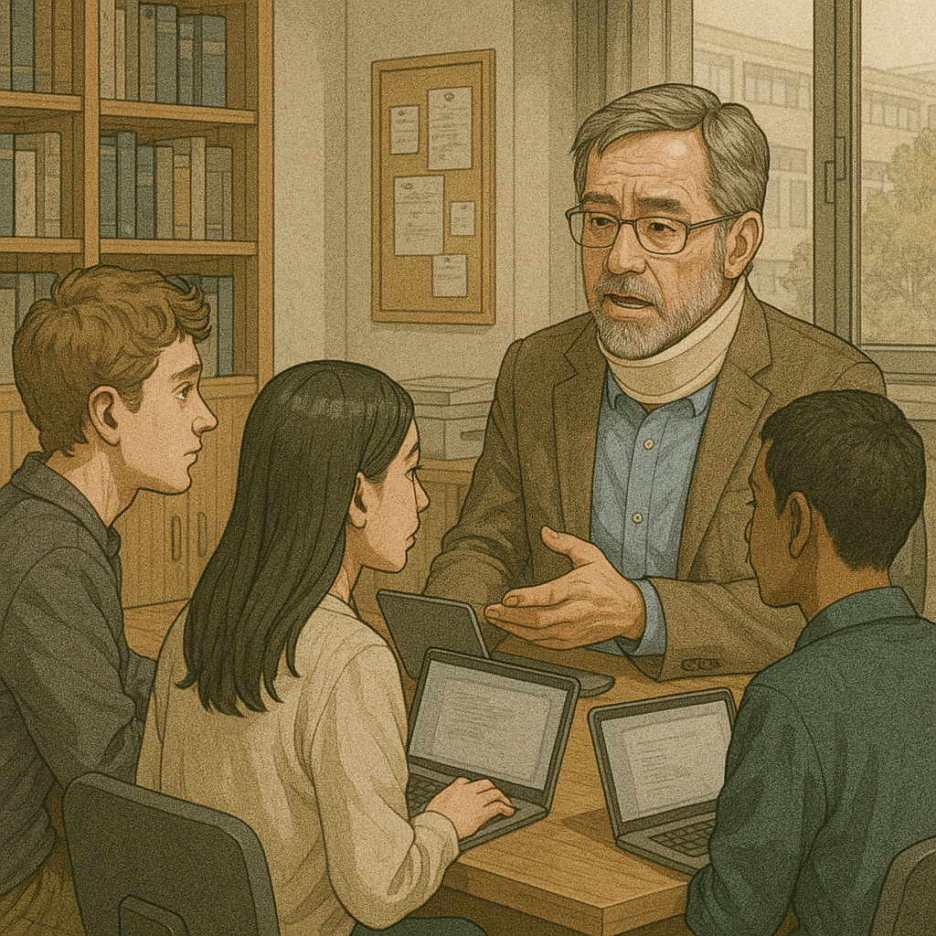 GPTさんに質問対応しているオジサンの絵を描いてもらいましたが、女子大勤務だということを伝え忘れましたね。しばらくしたら共学になりますけど、今はまだ質問医来るのは女性しかいません。質問に来てくれるということは理解しようとしているということですから、それ自体は本当に嬉しいんですよね。教えていても楽しいですし、対応していてその場で理解してくれていることが分かるとなお嬉しいですし。