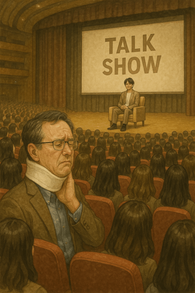 今日は大学でトークショーがあったので参戦してきました。・・・が、やはり首の痛みは酷く、メインの観客である学生さん達の邪魔にならない最後尾で見ていたのですが、目をこらしすぎてしんどくなってしまいました。GPTさんに描いてもらいましたが、本当に99%女性が見ているトークショーなので妙な緊張感もあり、と言う感じです。