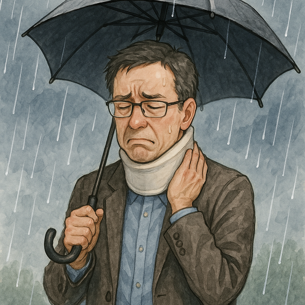 ムチウチになると雨の日にしんどい、ということを聞いたことはないでしょうか。私も例に漏れず雨が降ると(厳密には雨が降る前に分かる)首がうずき始めて痛くなるようです。人間天気予報装置みたいなものが出来上がって、雨が来る直前は身体が反応するようになってしまいます。久しぶりにぐずついた週間なので、今週は首の痛みが本当に酷い状態です。