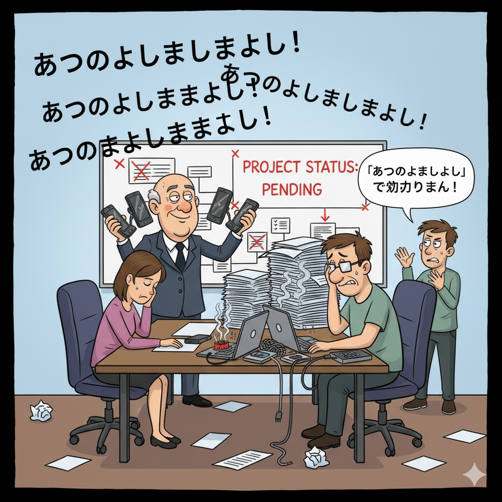 そんな状況をGeminiに描かせてみると、何を描いているのか文章はサッパリ分からなくても、その雰囲気だけはきちんと伝わってくる面白い絵を描いてくれました。「あつのよしましまよし!」って何のこっちゃサッパリ分からん!ってなりますが、それこそが「よろしくお願いします」と言われたときのこちらの頭の中ですね。「あつのよましよし」で効力りまん!とかも意味不明ですが、まぁ通じてしまうのが面白いところ。