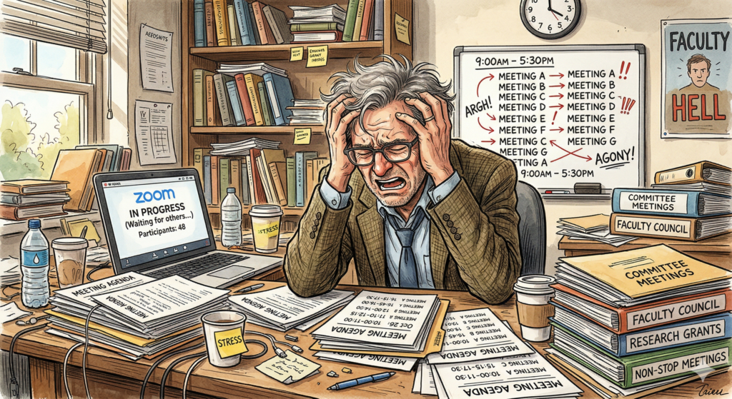 会議がバッティングしてしまうといろいろ問題発生なんですが、たまたま上手く時間がずれていた会議とかでちょうどよく話せたりすると意外とスッキリしたりもします。フルタイムで出ると大変なので次の会議があるので,と抜けられるのは意外と大きい。