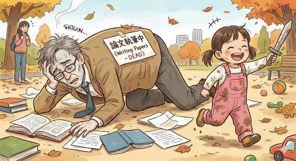 A: 大切なのは、親が笑顔でそばにいることです。疲労困憊でイライラしたり、怪我を見逃したりする方が娘さんにとってのリスクになります。親が安全に見守れるよう休憩を取ることは、最高の育児行動だと自信を持ってください。論文を頑張った自分を労わる時間だと捉えましょう。