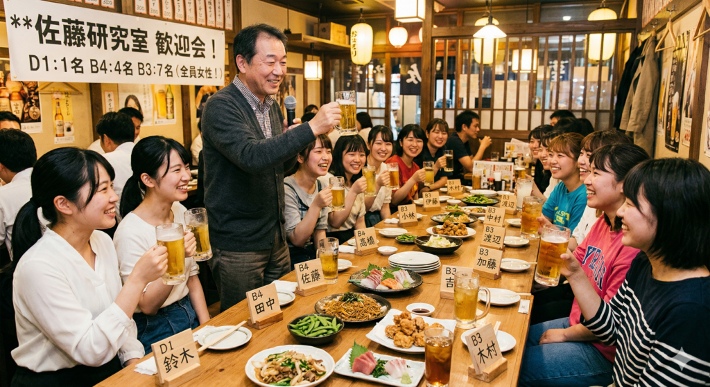 女子大の教員なので雰囲気的にはこんな飲み会になりますけど、まぁ、明らかに先生が浮きますよね。店の手配とか全部私がやっていますが、これからは少しずつ学生さん主体で色々やってほしいなと思っています。お店選びとかアレルギー対応とか、結構幹事をやると普段知らない知識が身に付くので楽しいと思いますしね。最近は大きな飲み会みたいなモノを企画すること自体が減っているそうなので、最初は初めまして感があったうちの研究室生たちも、最後には打ち解けていたような幹事なので実施して良かったなって思います。